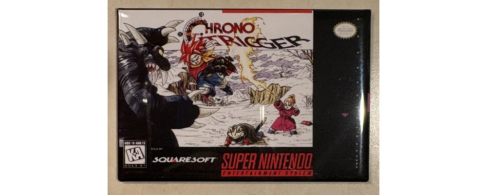 This is a brand-new 3.125 x 2.125-inch Chrono Trigger refrigerator magnet. The magnet is a reproduction of the original artwork from the video game. This high-quality, heavy-duty magnet is made of metal and mylar-coated hard plastic.