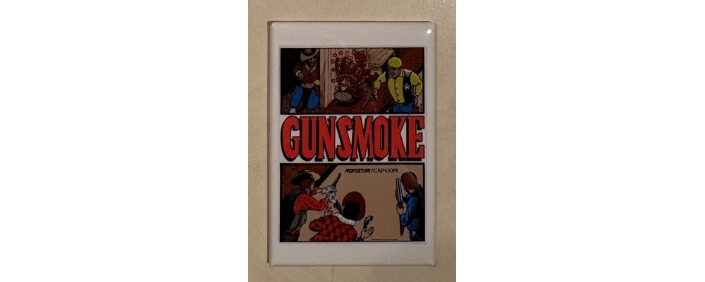 This is a brand-new 3.125 x 2.125-inch Gunsmoke refrigerator magnet. The magnet is a reproduction of the original artwork from the video game. This high-quality, heavy-duty magnet is made of metal and mylar-coated hard plastic.