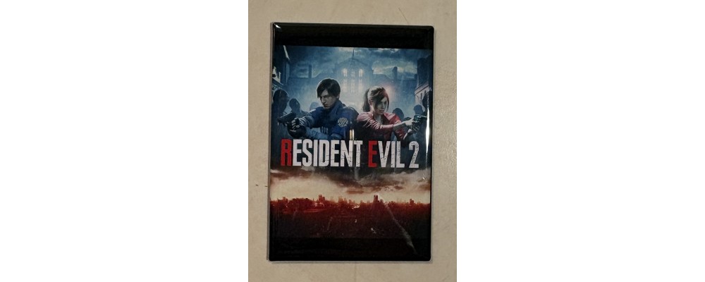 This is a brand-new 3.125 x 2.125-inch Resident Evil 2 refrigerator magnet. The magnet is a reproduction of the original artwork from the video game. This high-quality, heavy-duty magnet is made of metal and mylar-coated hard plastic.