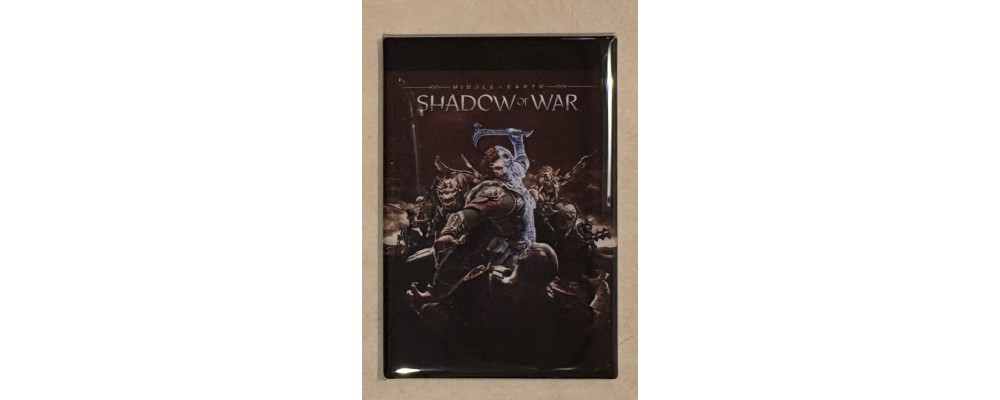This is a brand-new 3.125 x 2.125-inch Middle Earth: Shadow of War refrigerator magnet. The magnet is a reproduction of the original artwork from the video game. This high-quality, heavy-duty magnet is made of metal and mylar-coated hard plastic.