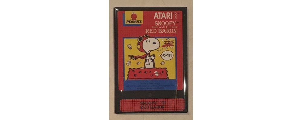 This is a brand-new 3.125 x 2.125-inch Snoopy and the Red Baron refrigerator magnet. The magnet is a reproduction of the original artwork from the video game. This high-quality, heavy-duty magnet is made of metal and mylar-coated hard plastic.